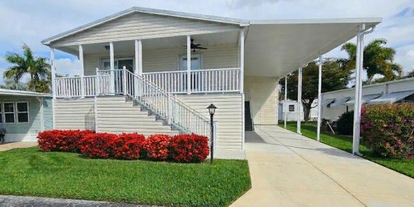 This home was installed by LeeCorp Homes on another lot. This AI generated image shows lot 22 with a 3BR 2BA home installed with landscaping. This home features concrete reinforced support piers that provide a useful storage space below the house. This lot is an opportunity to customize your winter retreat in Fort Myers.